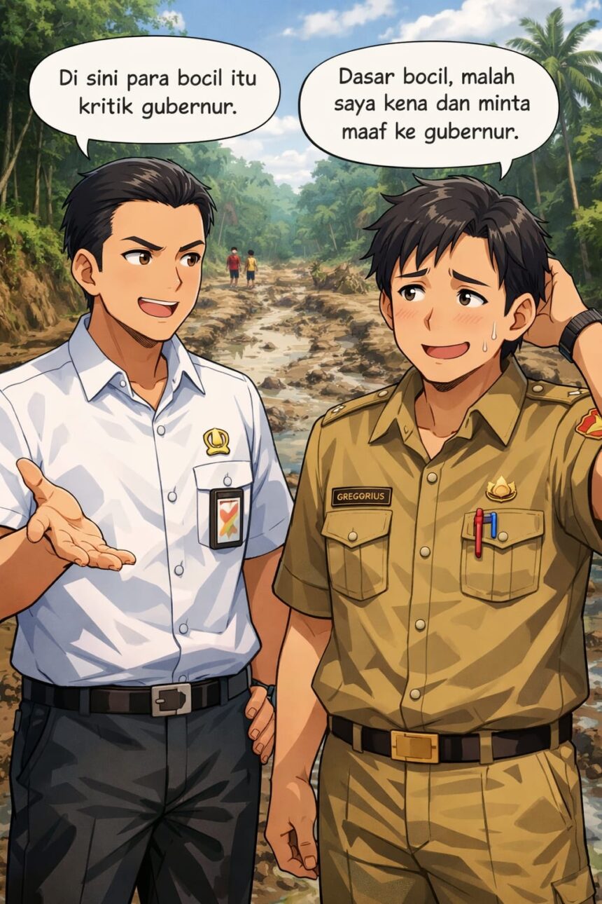 Beberapa hari kemudian, Kepala Dinas PUPR Kalbar turun gunung dengan wajah serius. “Eh, jalan itu kewenangan Kabupaten Sintang, wak. Bukan provinsi. Nuan jangan salah sasaran.” Boom! Ternyata bocil itu lagi nembak Gubernur, tapi pelurunya nyasar ke wilayah kabupaten. Jalan Bedayan–Nanga Libau di Kecamatan Sepauk memang rusak parah, tapi wewenangnya ada di tangan Bupati Sintang, bukan gubernur.
