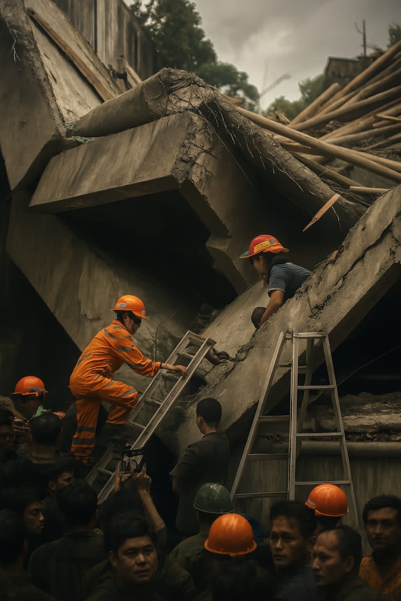 Dari balik reruntuhan itu, terdengar jeritan santri, lirih, parau, penuh debu dan darah. Mereka memanggil nama ibu, bapak, Tuhan, siapa saja yang sudi mendengar. Beton dan besi menindih tubuh mungil yang masih menyimpan hafalan surah pendek.