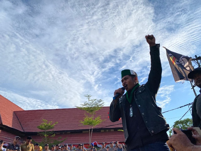 FOTO : Ketua HMI Cabang Sambas, Farhan saat berorasi dalam salah satu aksi [ ist ]
