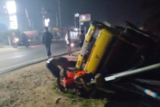 Hindari Tabrakan dengan Pikap di Depan SPBU, Truk Muatan Cangkang Sawit Terperosok ke Parit