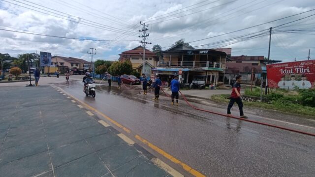 Sigap, Satlantas Polres Sekadau dan Damkar Bersihkan Tumpahan Solar di Bundaran PKK