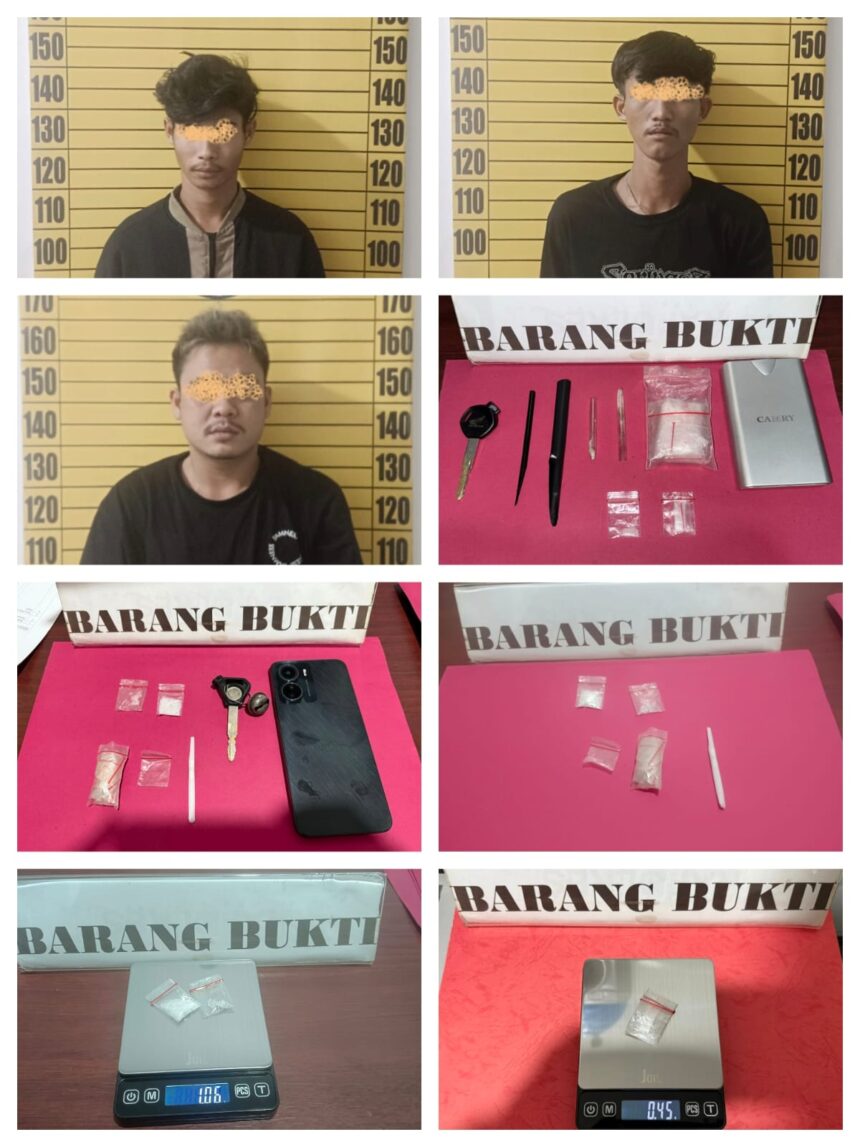 Ketiga tersangka berinisial R, G, dan EI ditangkap di lokasi berbeda setelah polisi menindaklanjuti laporan masyarakat terkait aktivitas peredaran gelap narkoba di Dusun Hilir Tengah II.