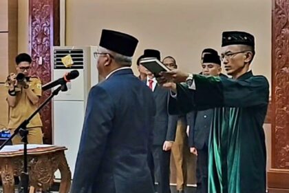FOTO : Seremonial pelantikan Sekda Sanggau Aswin Khatib saat mengikuti pengucapan sumpah…